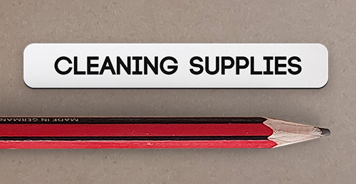 Cleaning supplies. White with black text
