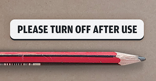 Please turn off after use. White with black text